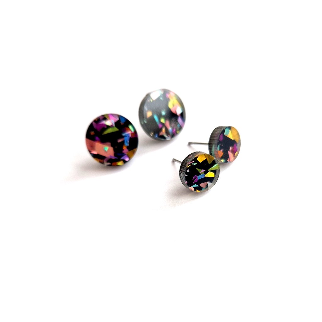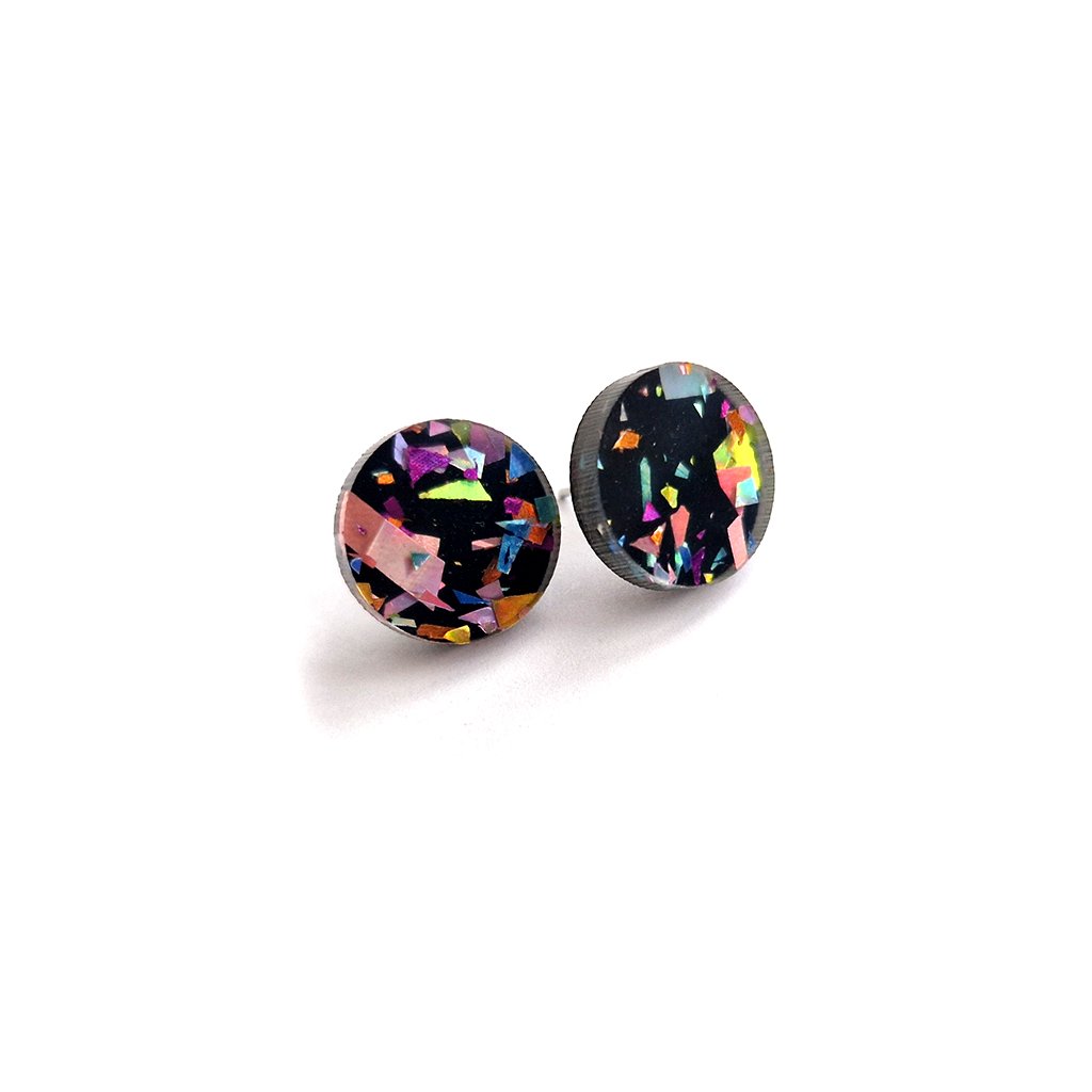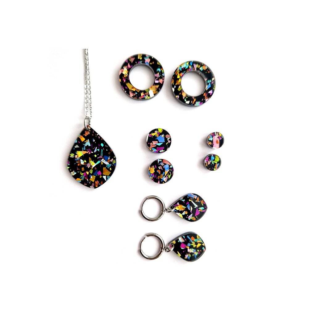 - Materiál: lesklý černý perspex s barevnými konfetkami