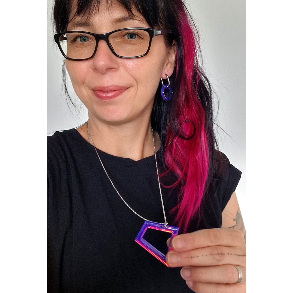 - Materiál: multibarevné akrylové sklo. Náhrdelník je zavěšen na kuličkovém řetízku z nerezové oceli v délce 70 cm. Takže ho krásně a rychle přetáhnete bez hlavu, i když už jste třeba jednou nohou ve dveřích.
